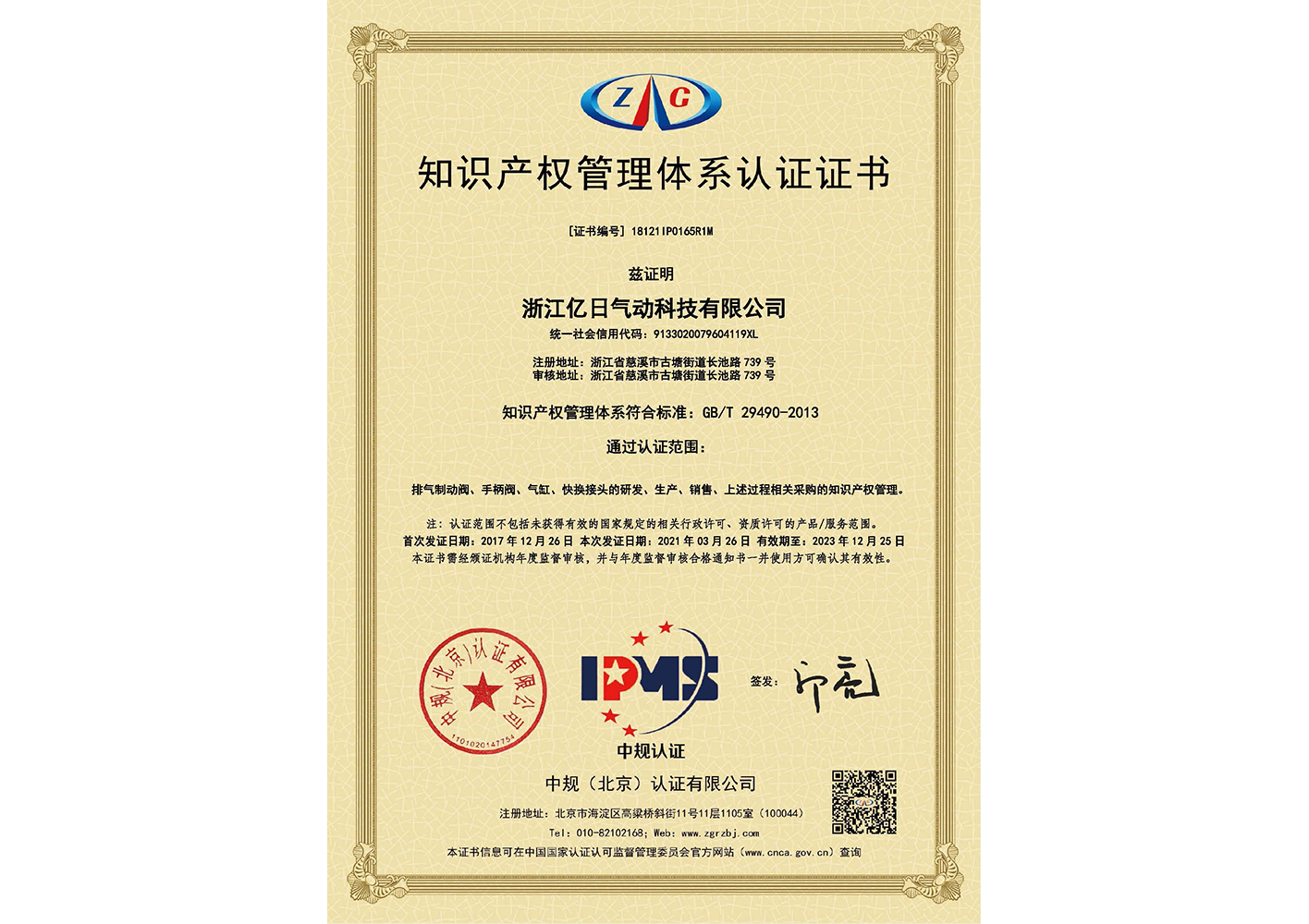 知識(shí)產(chǎn)權(quán)管理體系認(rèn)證證書