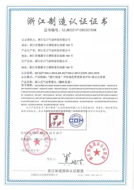 由我公司主導起草制訂的《插入式氣動管接頭》的“浙江制造”團體標準,涵蓋了產品設計、材料選擇、工藝控制、性能指標、檢測方法和質量承諾等內容,其中多項性能指標均優于國家和行業標準。
